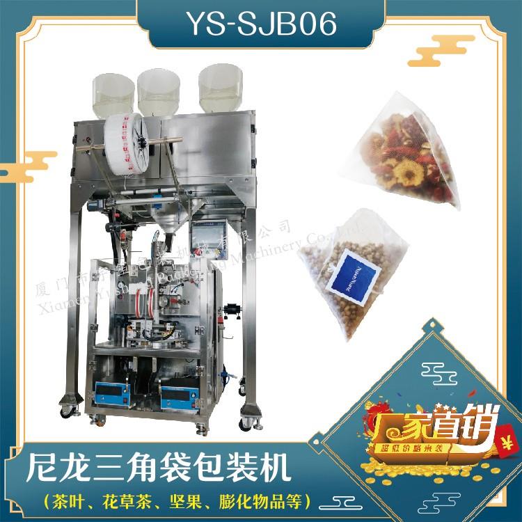 YS-SJB06尼龍三角袋包裝機(電子秤系列) 特點 1、適用于綠茶、紅茶、花茶、咖啡、中國茶、健康茶、中藥茶、顆粒等。2、可用于平面袋包裝、三角立體包裝等形式包裝袋。3、整機可自動完成上料、計量、制袋、封口、切斷、計數(shù)、成品輸送等功能。4、選用進口超聲波封口,電子稱計量下料方式,封口牢固,下料準確。5、包裝材料:…