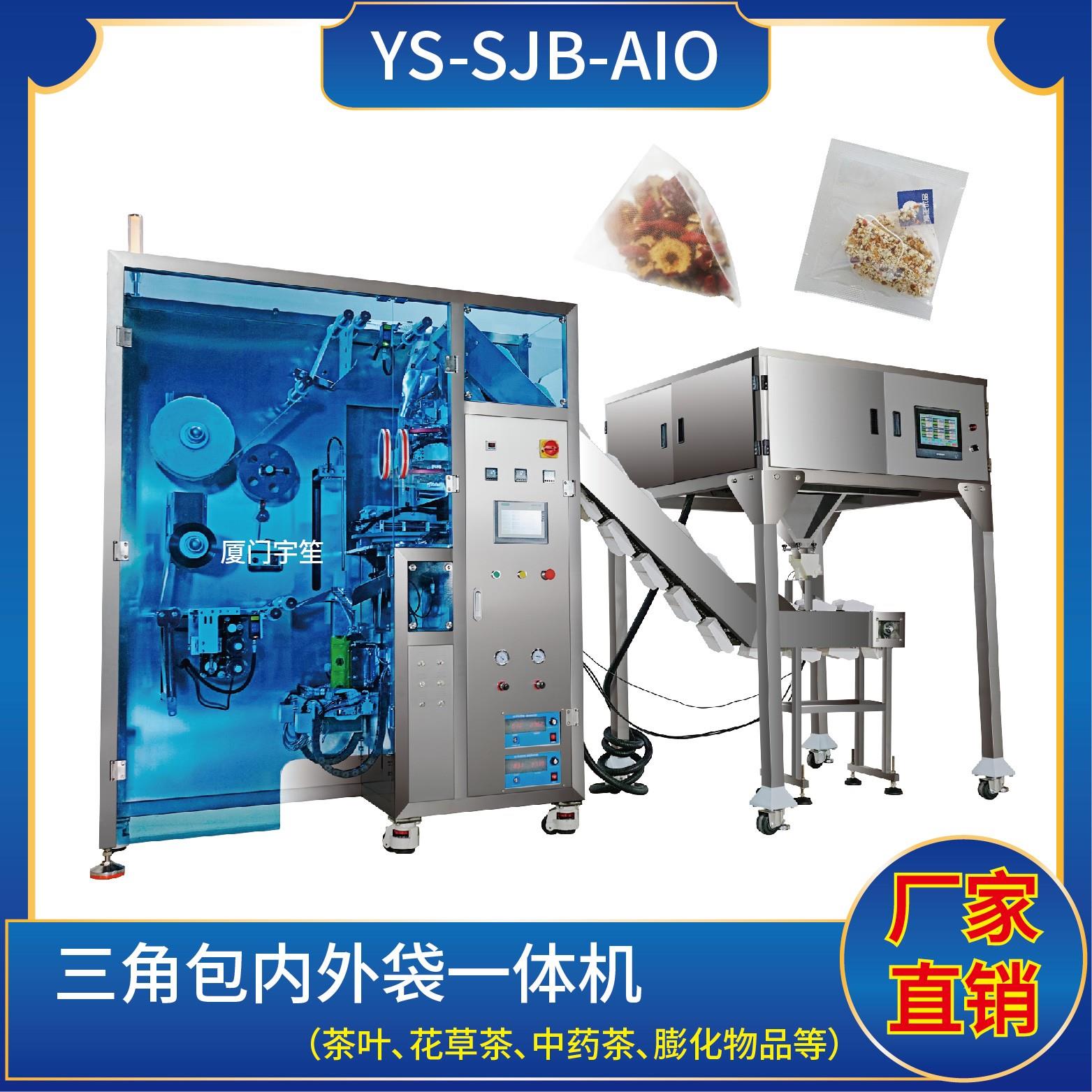 YS-SJB-AIO 三角包內(nèi)外袋一體機特 點 1、適用于綠茶、紅茶、花茶、咖啡、中國茶、健康茶、中藥茶、顆粒等。2、可用于平面袋包裝、三角立體包裝等形式包裝袋。3、整機可自動完成上料、計量、制袋、封口、切斷、計數(shù)、成品輸送等功能。4、選用進口超聲波封口,電子稱計量下料方式,封口牢固,下料準確。5、包裝材料:尼龍、P…